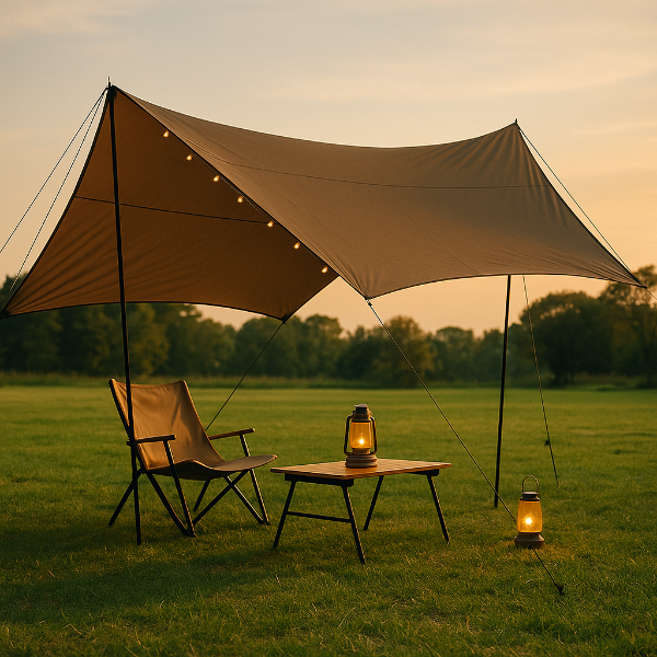 ‘타프(Tarp)’는 넓은 천막 형태의 구조물로, 햇빛과 비를 피하고, 쉼터 공간을 만들어주는 도구입니다. 이제는 기능을 넘어 감성 캠핑 연출의 핵심으로 자리 잡았어요.