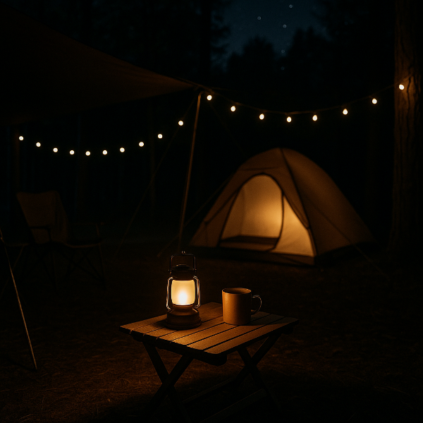 - 랜턴 1개 + 무드등 2개 (테이블/침낭 옆)