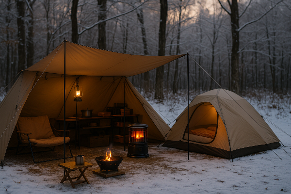 | 장비 구성 | 기본 텐트, 테이블, 화로대 | 대형 쉘터, 확장 전기/난방/수납 시스템 |